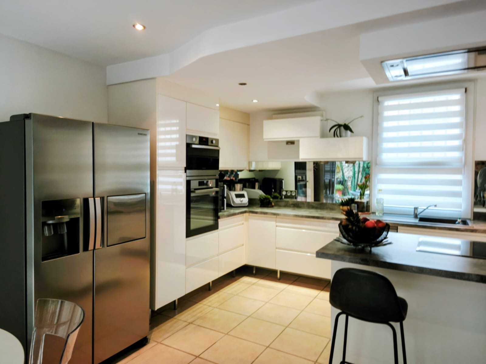 En entrant, vous découvrirez un vaste séjour avec de grandes baies vitrées donnant sur un patio arboré, sans vis à vis, la cuisine ouverte s’ouvre elle aussi sur le patio.